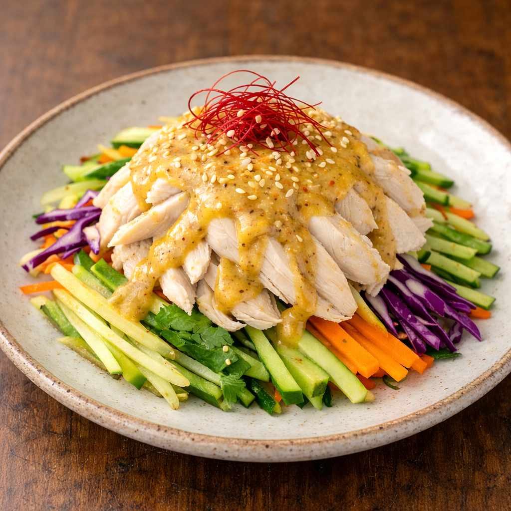 담백한 닭가슴살과 아삭한 채소를 겨자소스로 깔끔하게 버무린 여름철 별미입니다.