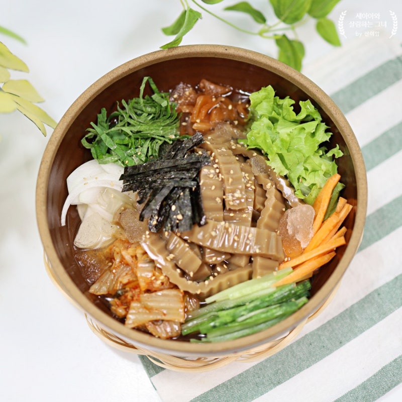 탱글한 도토리묵에 시원한 육수와 아삭한 채소를 더한 여름철 별미로 입맛 없을 때 딱 좋은 개운하고 담백한 한 그릇 음식입니다.