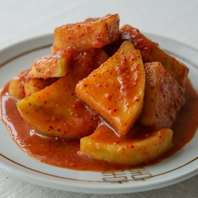 큼직하게 썬 무에 고춧가루, 마늘, 생강, 젓갈 등의 양념을 버무려 담근 김치의 일종으로, 숙성될수록 시원하고 깊은 맛이 살아나며, 쿰쿰하지 않고 깔끔한 끝맛이 특징입니다.
