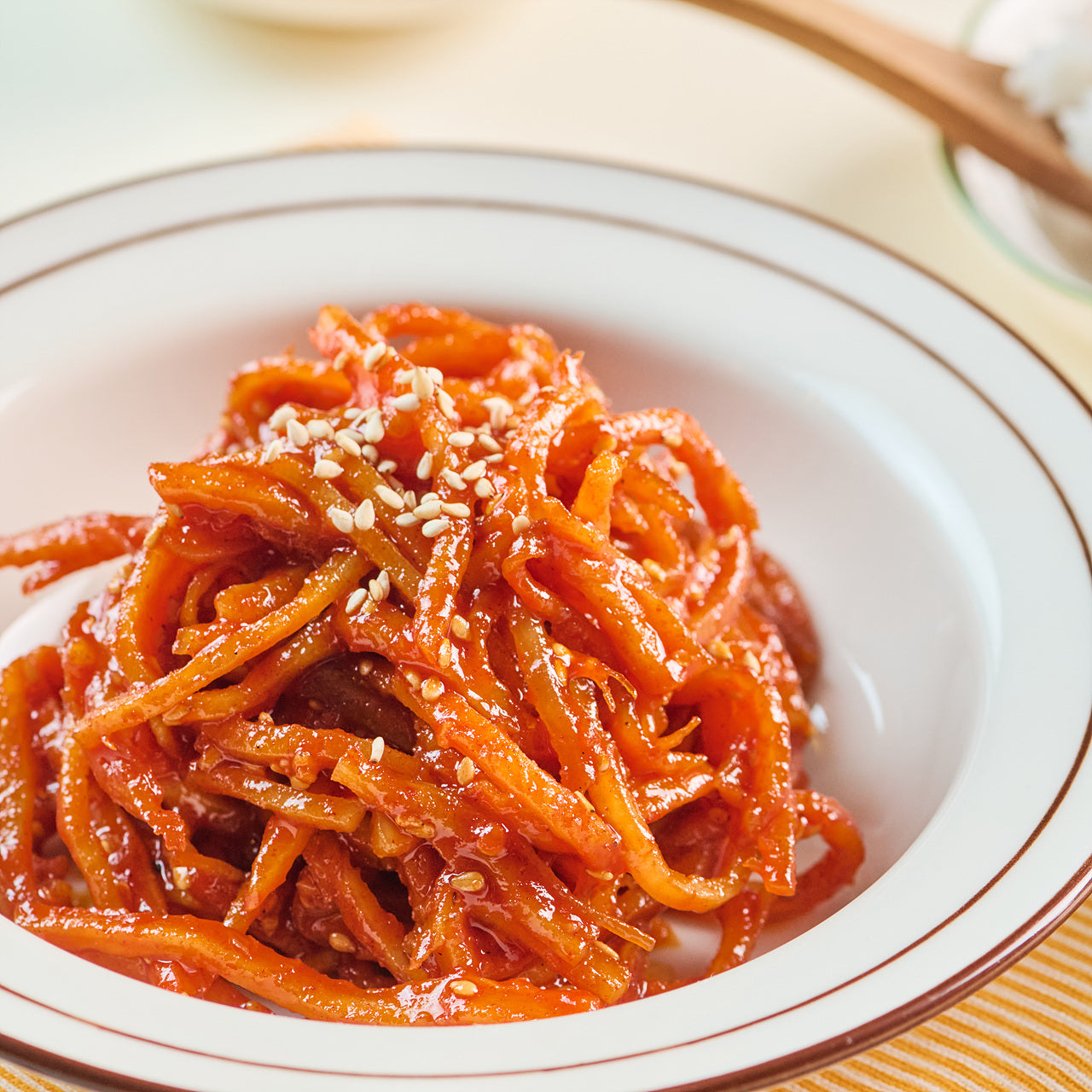 마른 오징어채(진미채)를 고추장, 설탕, 마늘, 참기름 등으로 볶아낸 한국의 전통 반찬으로 달콤하면서도 매콤한 고추장 양념이 쫄깃한 오징어채에 잘 배어 있는 맛입니다.