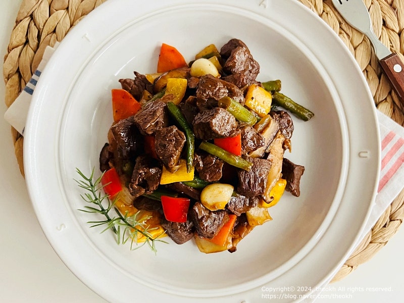 두툼한 소고기와 신선한 채소를 달콤짭짤한 소스에 볶아낸 요리입니다.